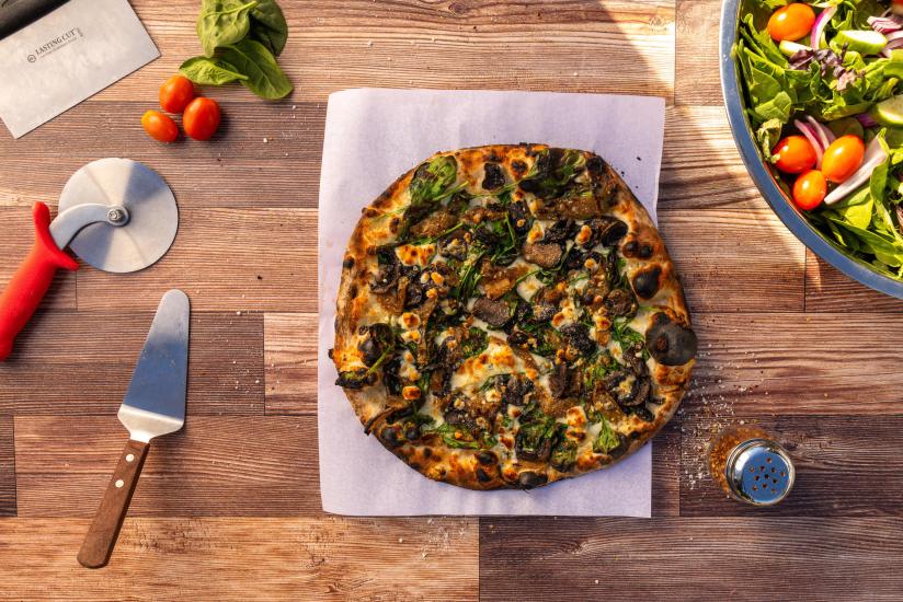 - Spinach, mushroom, caramelized onion, and gorgonzola